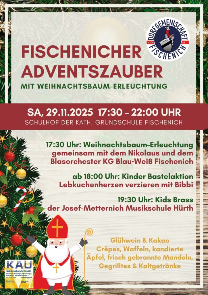Am Samstag, 29. November 2025, laden wir wieder herzlich zum beliebten Fischenicher Adventszauber auf den Schulhof der Katholischen Grundschule Fischenich ein.