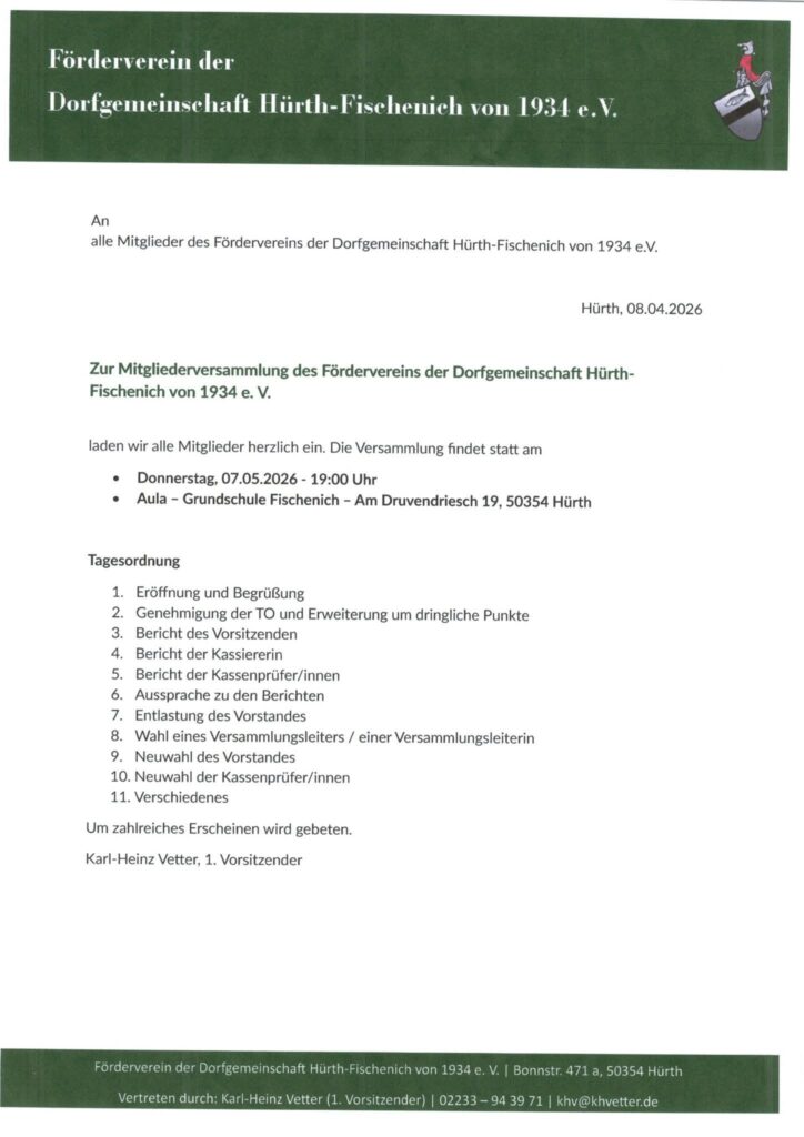 Der Förderverein der Dorfgemeinschaft Hürth-Fischenich von 1934 e.V. lädt alle Mitglieder herzlich zur diesjährigen Mitgliederversammlung ein.