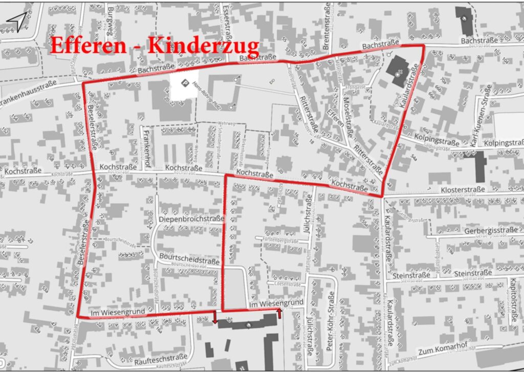 - Efferen Kinderkarnevalszug – 10:00 Uhr, ab Schulhof im Wiesengrund: Kinderumzug der Ortsgemeinschaft Hürth-Efferen. (Zugweg: Im Wiesengrund – Orsbeckstraße – Kochstraße – Kaulardstraße – Bachstraße – Beselerstr – Im Wiesengrund) Auflösung ca 12.00Uhr